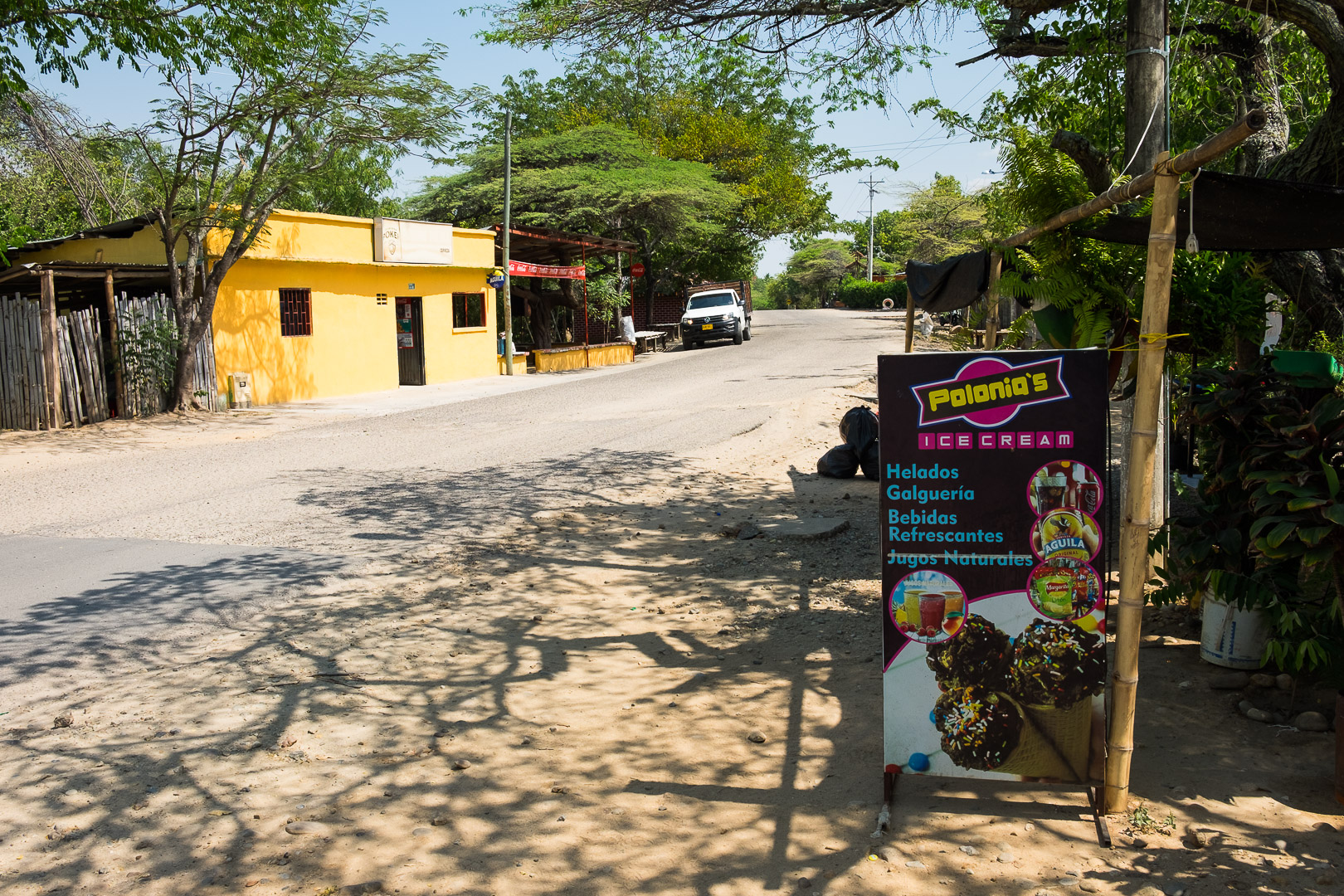 Przystanek robimy w wiosce Polonia. Powód oczywisty, fajnie byłoby zrobić sobie zdjęcie ze znakiem odnoszącym się do Polski pośrodku Kolumbii. Niestety, tabliczki brak, a jedyna wzmianka o nazwie znajduje się na reklamie lodów przy sklepie. Dobre i to. W taki upał nie pogardzimy lodami i litrem gaseosy [słodki napój gazowany]. Nie śpieszymy się korzystając z dużej płachty tworzącej cień nad kilkoma stolikami przy sklepie. Nie wygania nas nawet durnowata telenowela. Sam obraz mógłbym zignorować, ale do moich uszu docierają zdania, które rozumiem. Czyli nauka języków ma jednak wady!