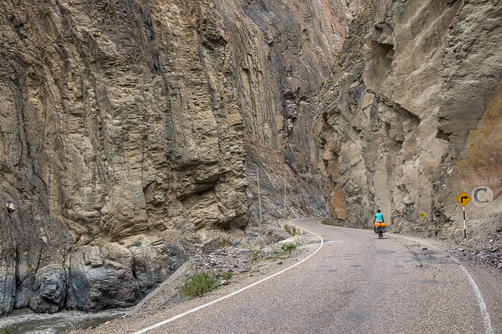 Wpierw jednak założyliśmy na głowę lampki, oświetliliśmy rowery i musieliśmy zmierzyć się z najbardziej stresującą drogową przeszkodą. Tunelem. Tunele w Cañon del Pato są malownicze. Wykute w skale dziury umożliwiły poprowadzenie wąskiej nitki drogi. Bez takich inwestycji nawet piesza ścieżka byłaby tu niemożliwa. Tunele nie są długie, ale jest ich kilkanaście, a może nawet kilkadziesiąt. Nie liczyłem, liczyłem tylko na siebie.