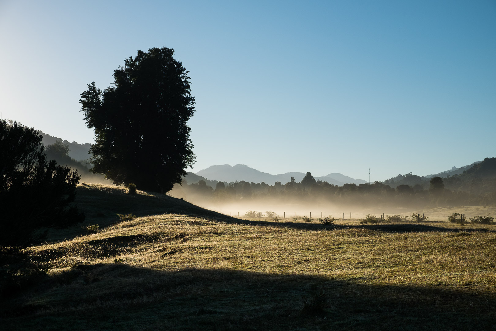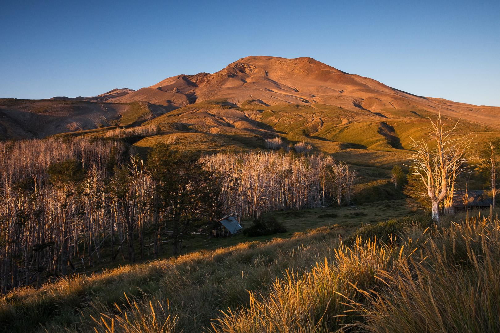 Ruszamy około 14. Trasa do schronu nie jest długa, ani trudna technicznie, ale stroma. Przewyższenie około 1000 metrów. Idziemy przez las, wydeptaną ścieżką, nie sposób się zgubić, a nawet gdybyśmy próbowali zniknąć w lesie, to nie jest to proste, bo jak w wielu miejscach w Chile, tu też są płoty kolczaste. Ostatnie pół godziny to spacer przez odradzający się po erupcji las, potem kilkadziesiąt metrów przez trawiasty teren, oświetlony przez popołudniowe słońce. Wiatr uspokoił się zupełnie. Jesteśmy sami. Cieszymy się absolutną ciszą, spacerujemy boso po trawie, brudzimy nogi białym pyłem, którym jest pokryta. W istocie mocno tutaj wiało w ostatnich dniach i stąd efekt. Kilkadziesiąt metrów od schroniska jest koryto strumienia, który czasem wysycha. Tym razem woda kapała jak z niedokręconego kranu, ale była. Napełniliśmy kilka dodatkowych butelek, żeby zostawić je w schronisku dla przyszłych odwiedzających. Słońce zachodzi szybko, co nas cieszy, bo łatwo zasnąć, a w planie mamy oglądanie wschodu słońca ze szczytu.