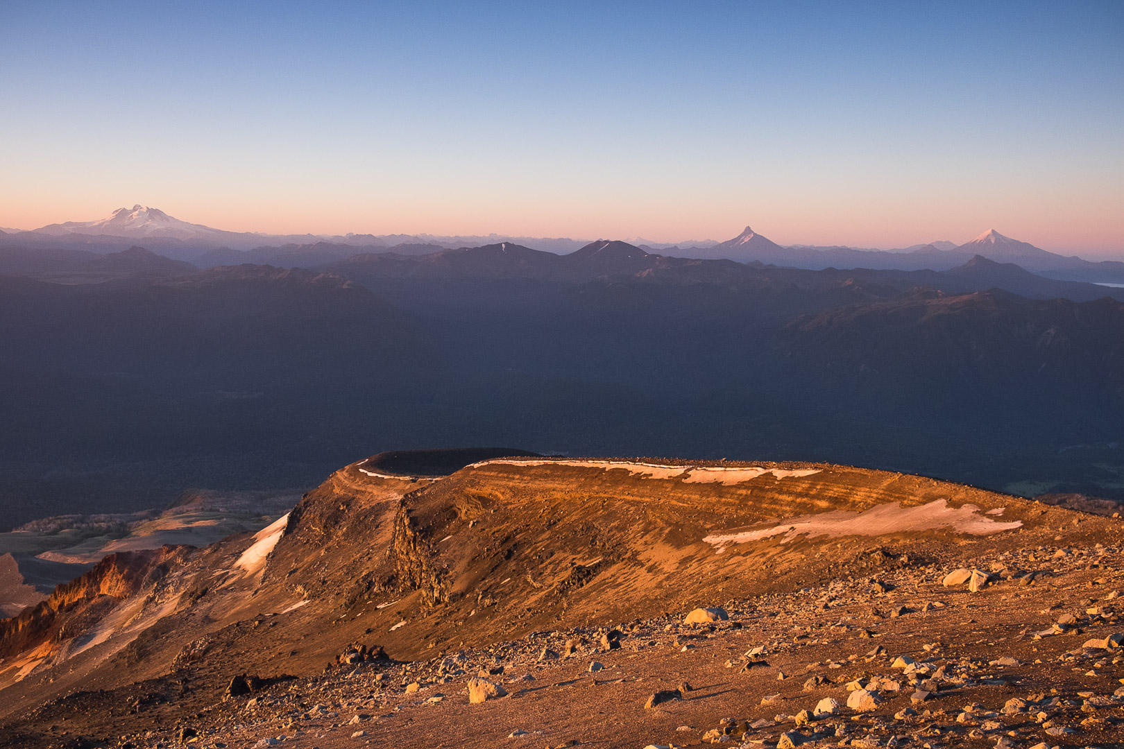 Wstajemy przed 6, dajemy sobie około 2 godzin na pokonanie 800 metrów przewyższenia. Bierzemy pod uwagę, że ścieżka prowadzącą do krateru może nie być zbyt wyraźna, zwłaszcza w nocy. W istocie pierwsze 15 minut idzie się bardzo wygodnie, a potem bardzo różnie. Momentami szlak zupełnie znika mimo, że staramy się patrzeć na wszystkie znaki i ślad GPS. Wulkaniczne skały osypują się. Przy kraterze jesteśmy punktualnie. Słońce wychyla się zza horyzontu i odkrywa kolory otaczających nas gór, ale do krateru nie zajrzy jeszcze długo. Z każdej strony otaczają nas wulkany. Przypominamy sobie znane wcześniej nazwy: Puntiagudo porównywany do Matterhornu (2493 m n.p.m., ostatnia erupcja 1850 r.), Lanín (3776 m n.p.m., ostatnia erupcja 540 A.C.), idealny stożek Osorno (2652 m n.p.m., ostatnia erupcja 1869 r.), mniej regularny Tronador ( 3491 m n.p.m., wygasły) itd.